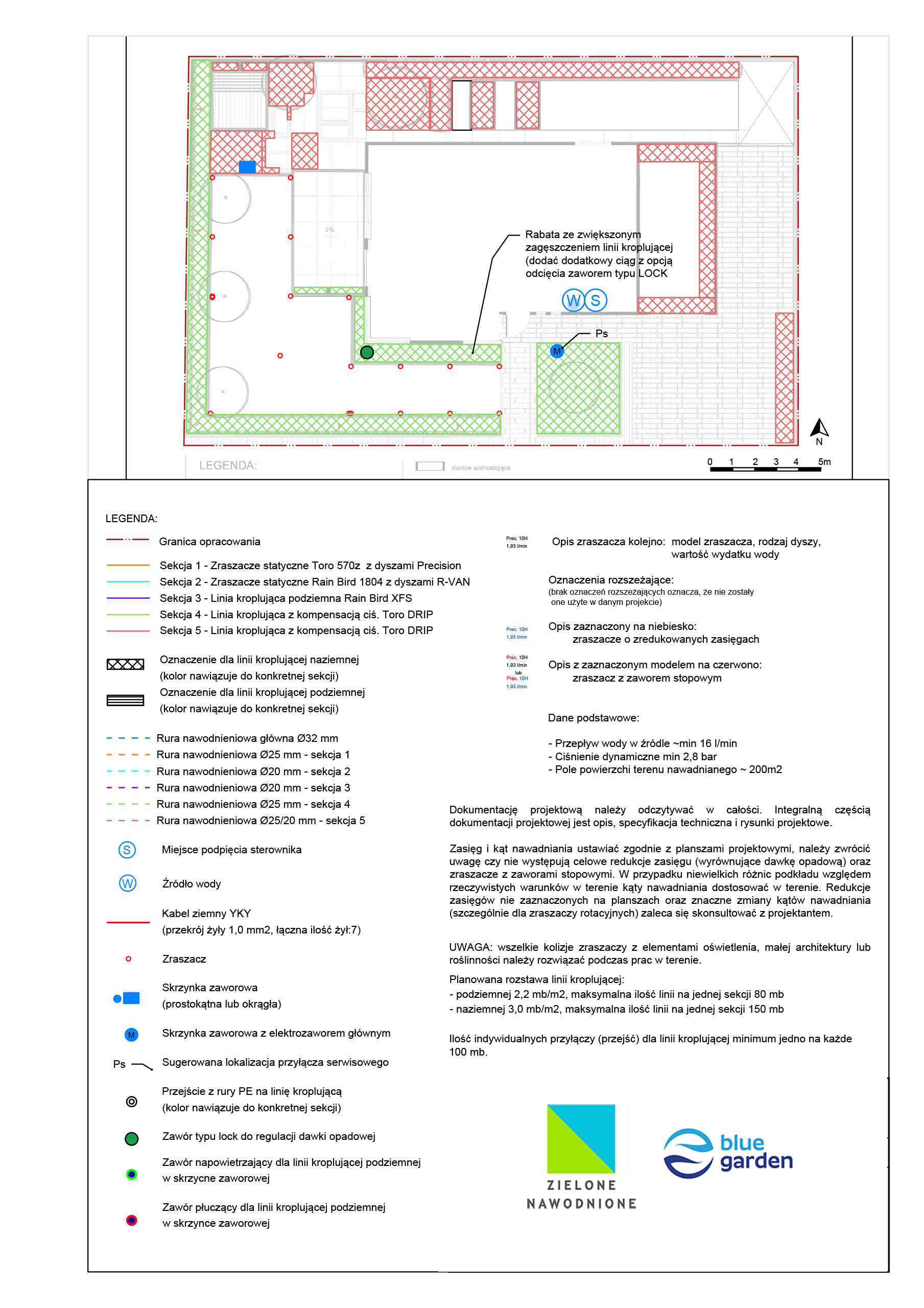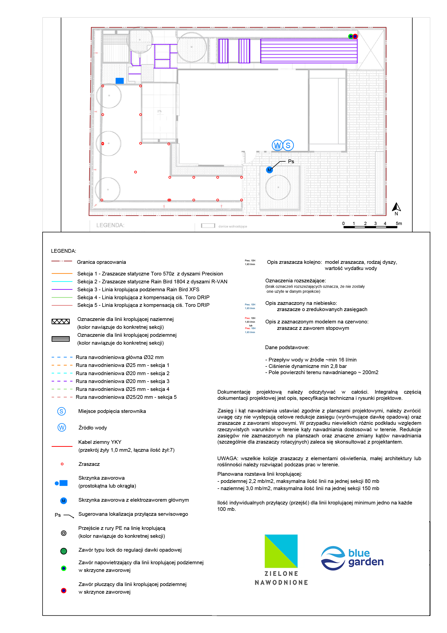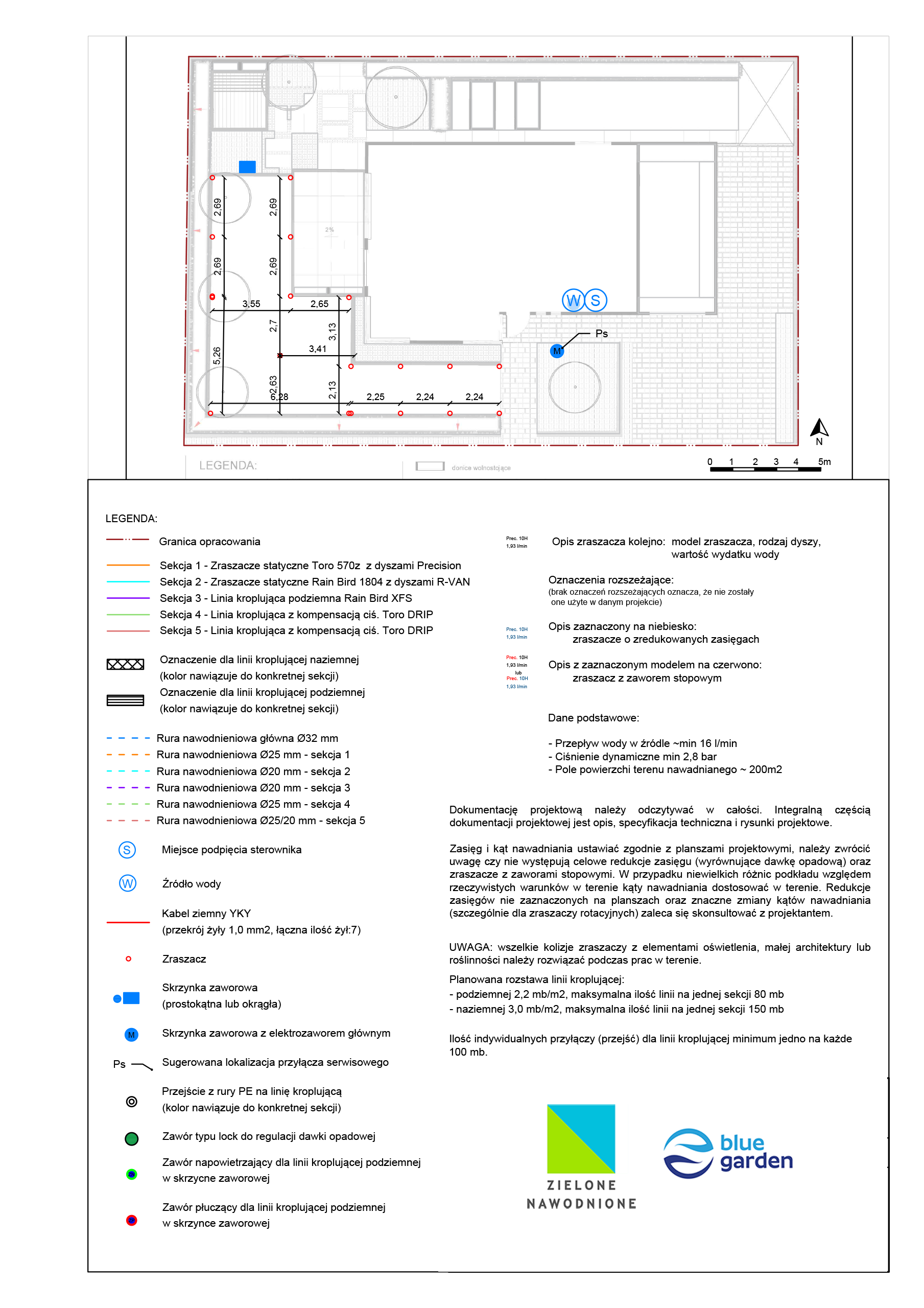 | Uwagi | Mimo małej powierzchni system podzielono na 5 oddzielnych sekcji. Jest to wynik niskich parametrów przepływu wody na źródle oraz specyfiki trawnika od strony północnej gdzie podjęto decyzje o wprowadzeniu nawadniania podziemną linią kroplującą. |