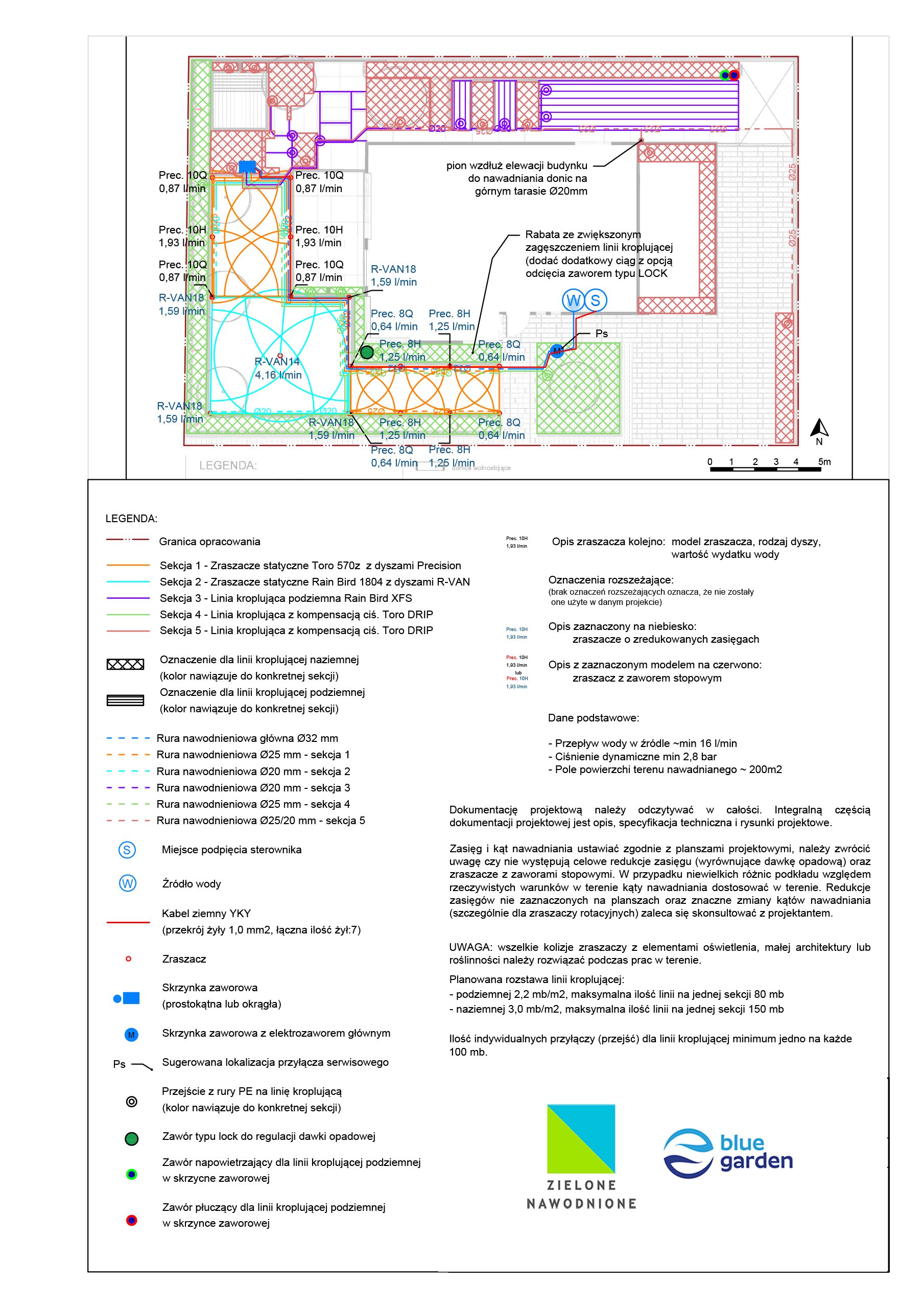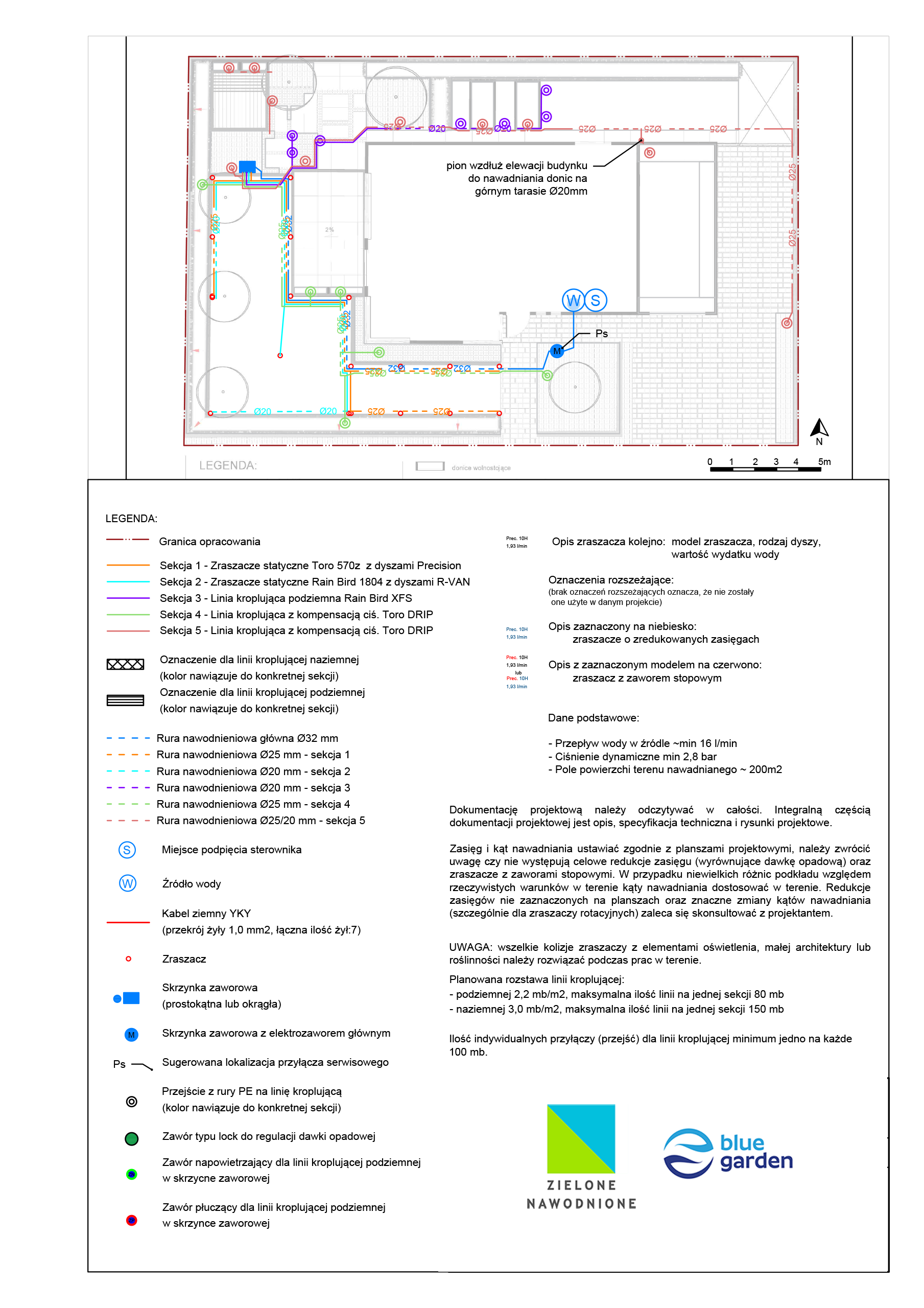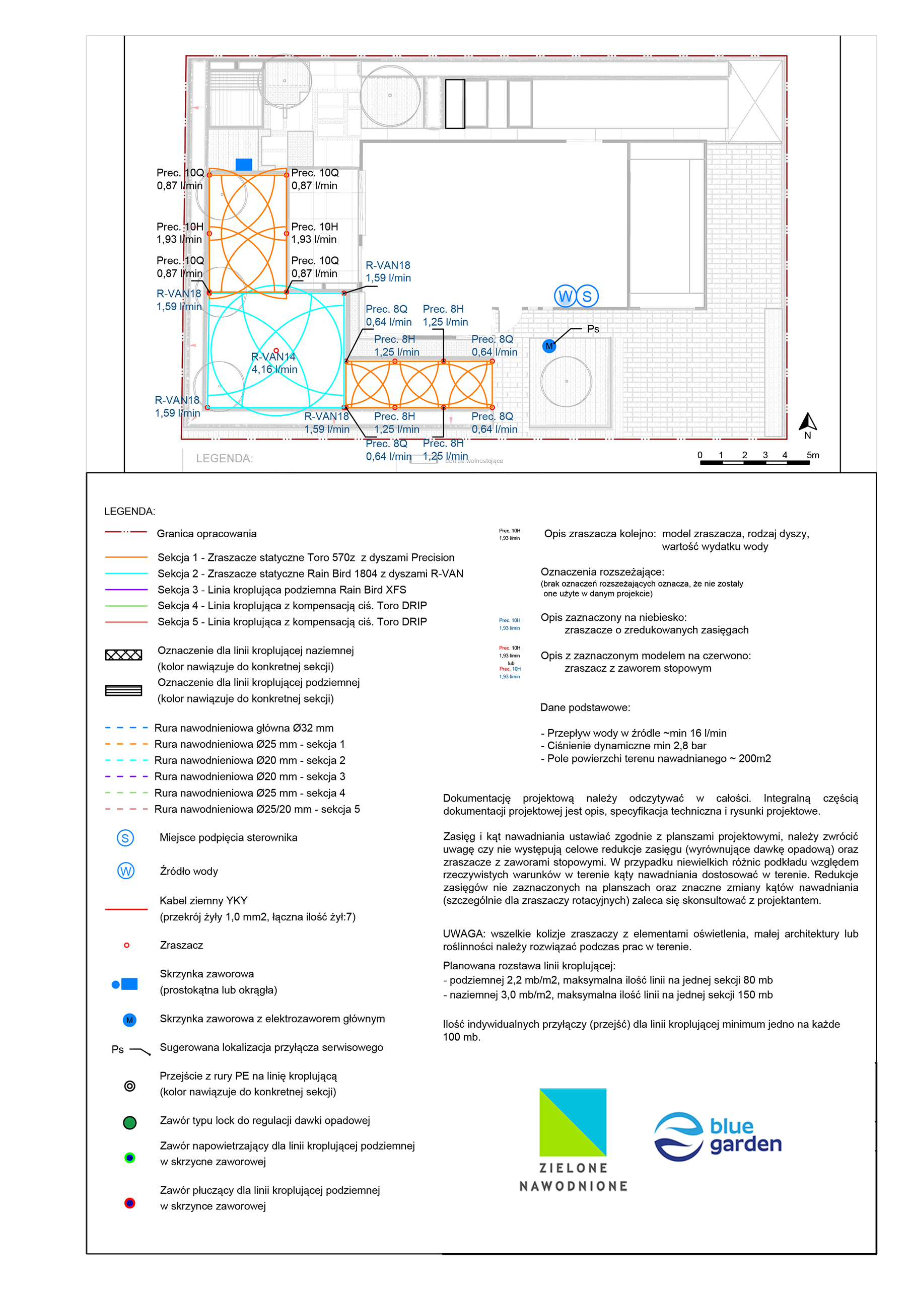 | Uwagi | Mimo małej powierzchni system podzielono na 5 oddzielnych sekcji. Jest to wynik niskich parametrów przepływu wody na źródle oraz specyfiki trawnika od strony północnej gdzie podjęto decyzje o wprowadzeniu nawadniania podziemną linią kroplującą. |