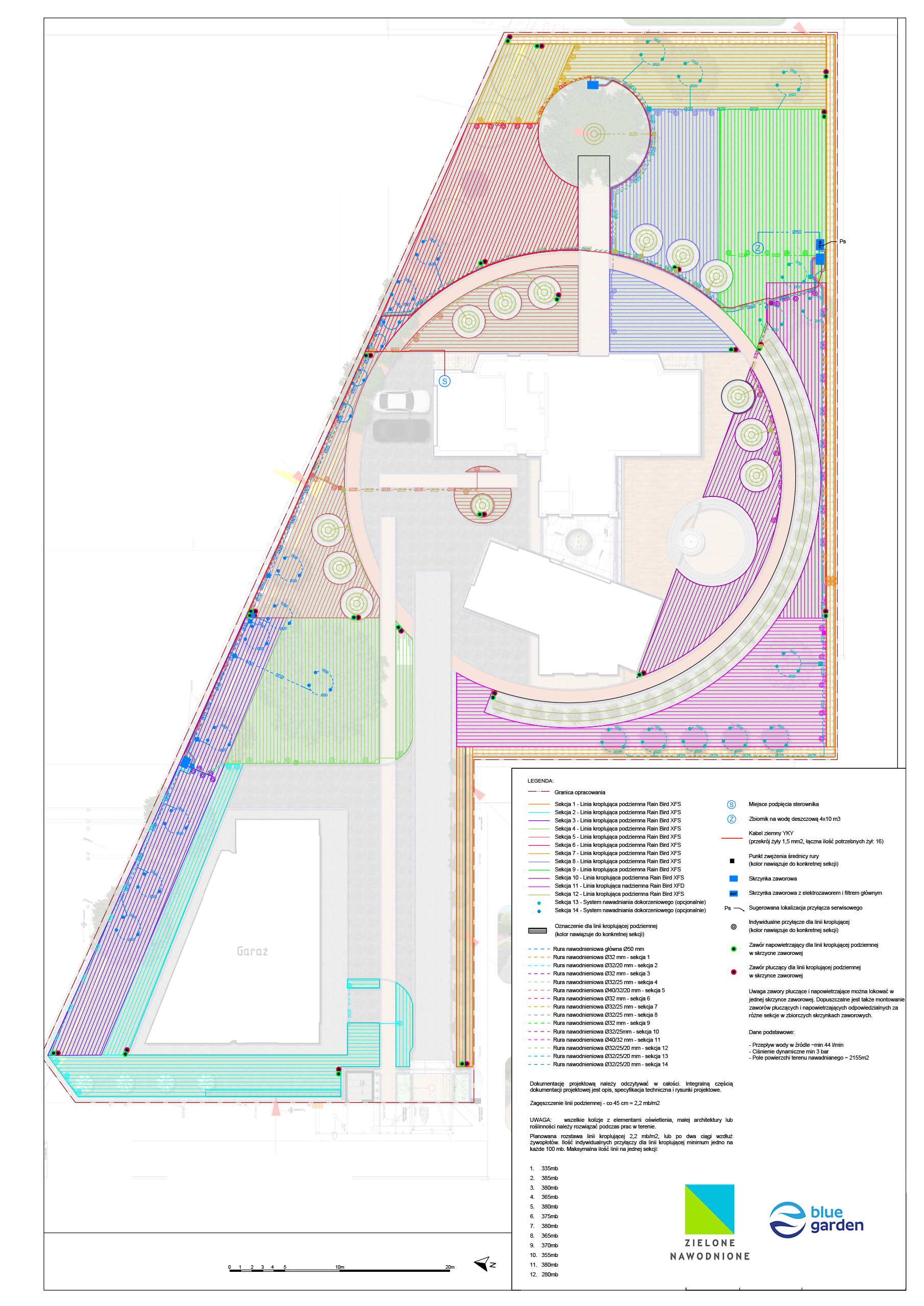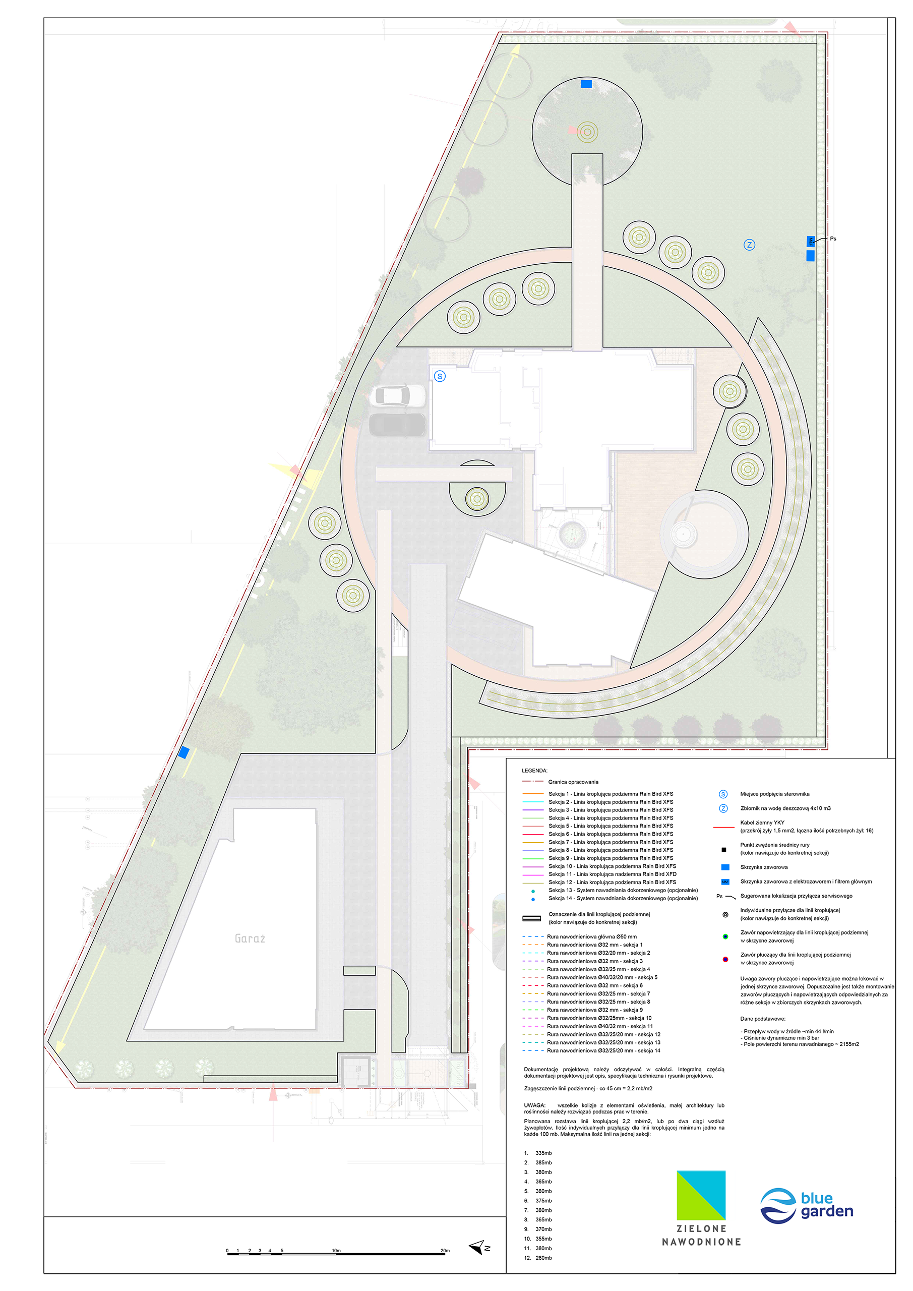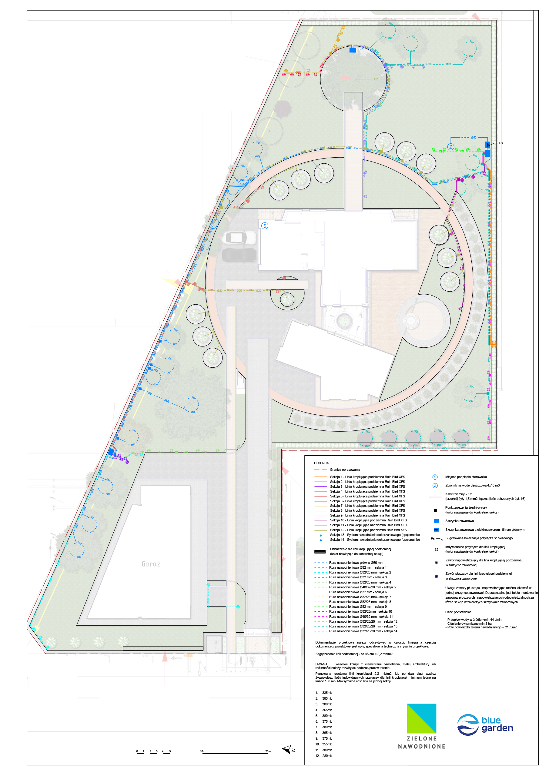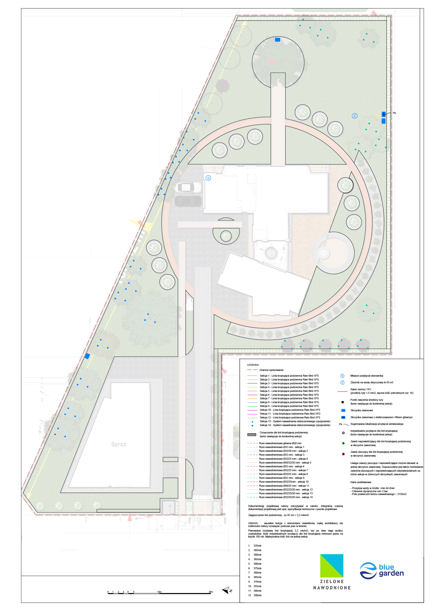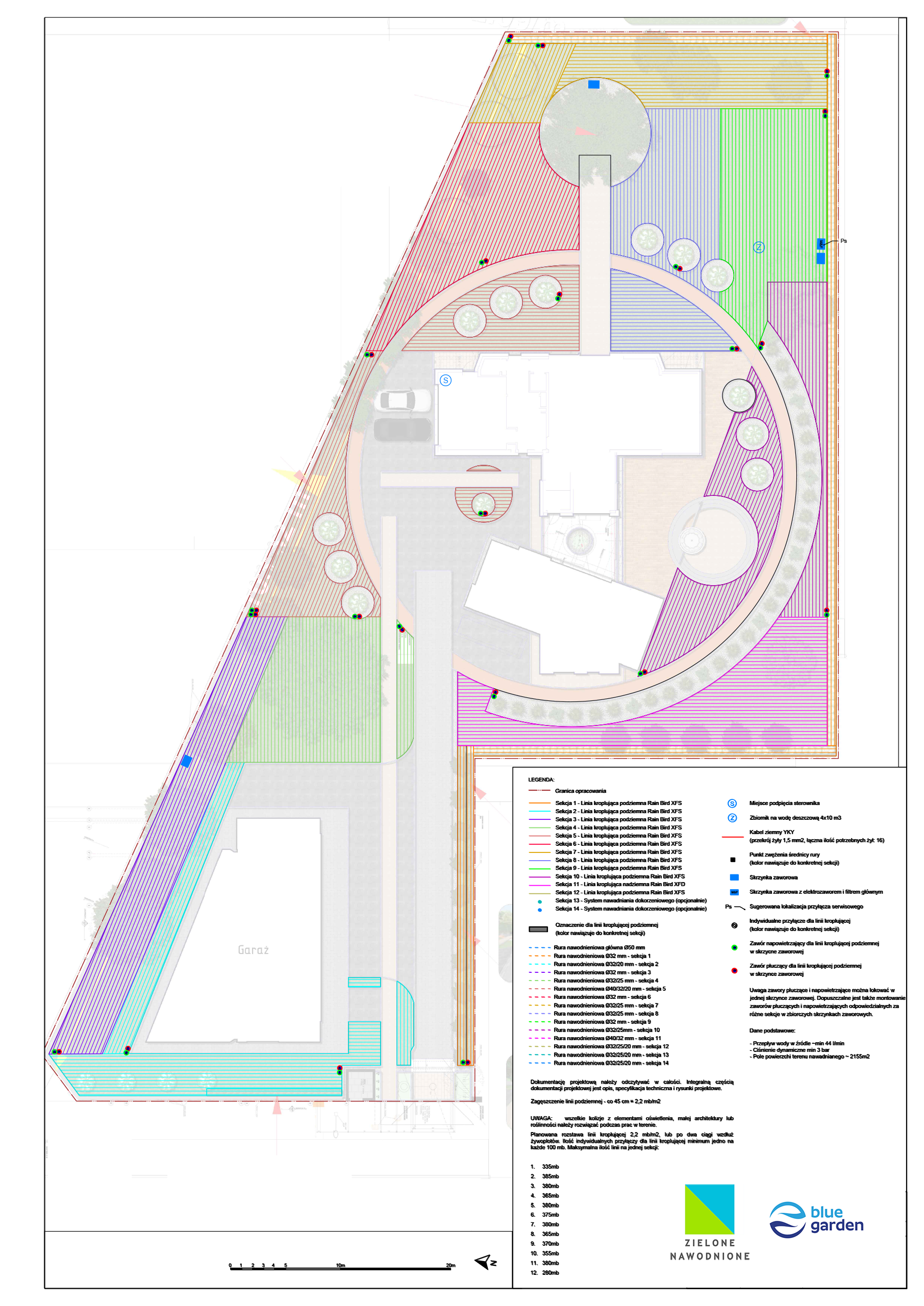 | Rodzaj nawadniania | Linia kroplująca podziemna (trawnik) – 11 sekcji Linia kroplująca naziemna (rabaty) – 1 sekcja Systemy dokorzeniowe (opcjonalnie) – 2 sekcje |